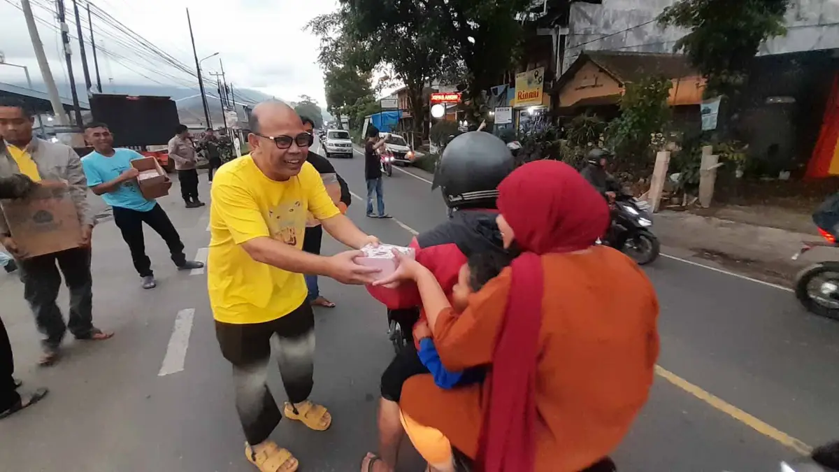 SUKABUMI.-Anggota DPRD Kabupaten Sukabumi Fraksi Partai Golkar HM Agus Mulyadi membagikan takjil kepada masyarakat yang melintas di Jalan Raya Sukabumi-Bogor, tepatnya di depan Terminal Cicurug, Desa Benda, Kecamatan Cicurug, Sabtu, 15 April 2023.