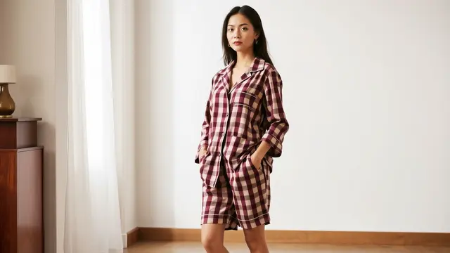 Gaya preppy yang chic. Piyama celana pendek bermotif kotak ini cocok untuk malam musim panas, sarapan di tempat tidur, atau video call sebelum tidur. Kain sutranya mewah, tapi motifnya tetap playful dan youthful, upgrade dari piyama lama yang membosankan.