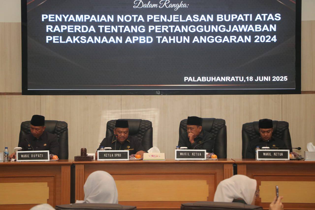 SUKABUMI Transmetro.id – Dewan Perwakilan Rakyat Daerah (DPRD) Kabupaten Sukabumi menggelar Rapat Paripurna agenda penyampaian nota penjelasan Bupati atas Rancangan Peraturan Daerah (Raperda) tentang Pertanggungjawaban Pelaksanaan APBD Tahun Anggaran 2024. Paripurna berlangsung di Ruang Rapat Paripurna DPRD Kabupaten Sukabumi, pada Rabu (18-06-2025).