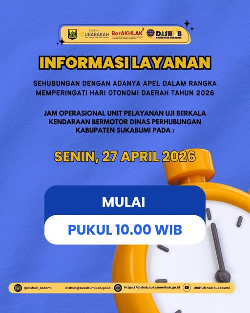Diberitahukan bahwa Jam Oppressional Unit Pelayanan Uji Berkala Kendaraan Bermotor Dinas Perhubungan Kabupaten Sukabumi dilakukan mulai pukul 10.00 WIB.*