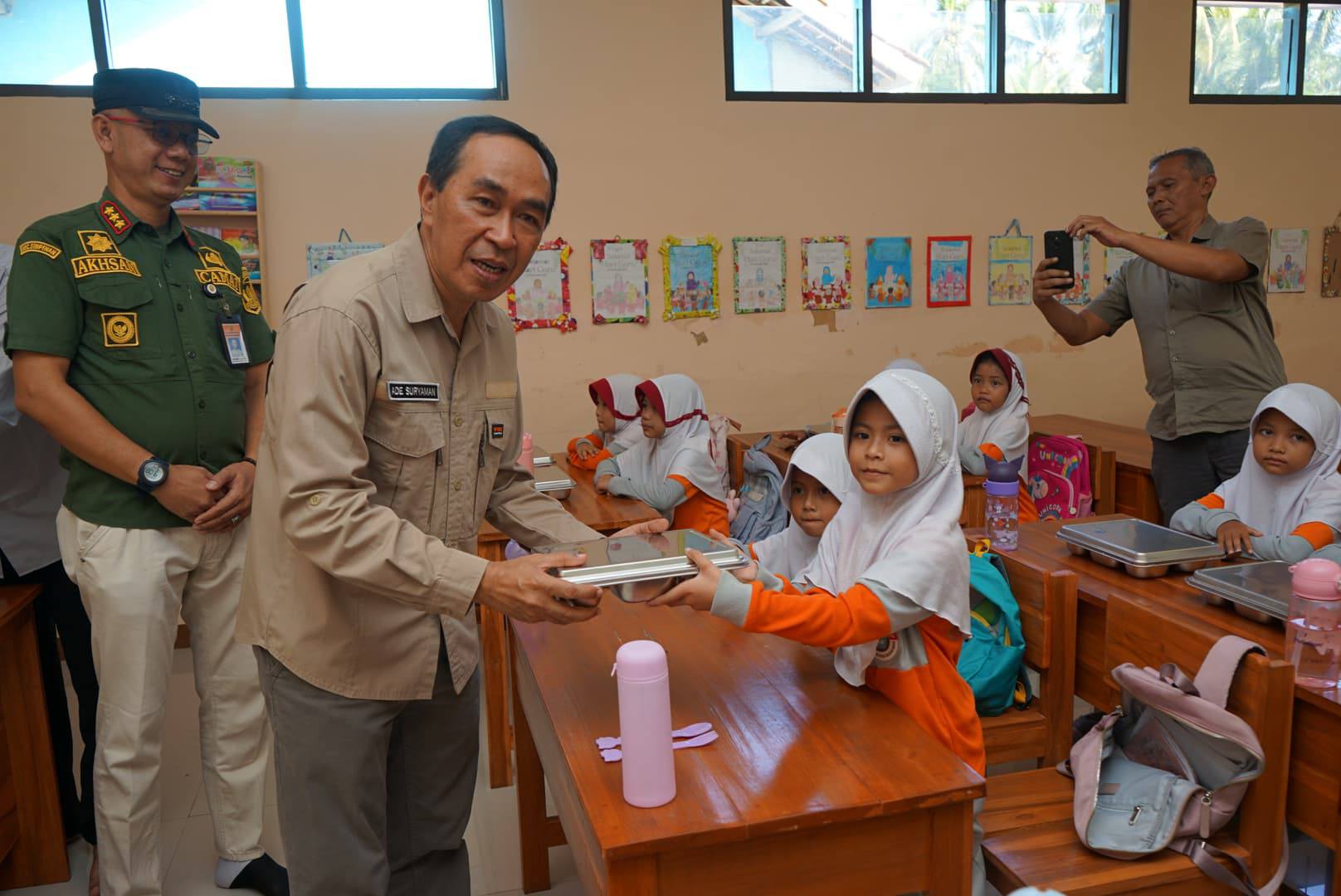 Usai meresmikan SPPG, secara simbolis Sekda Ade memberikan makan bergizi gratis kepada siswa SDN 3 Cidadap Kecamatan Simpenan.