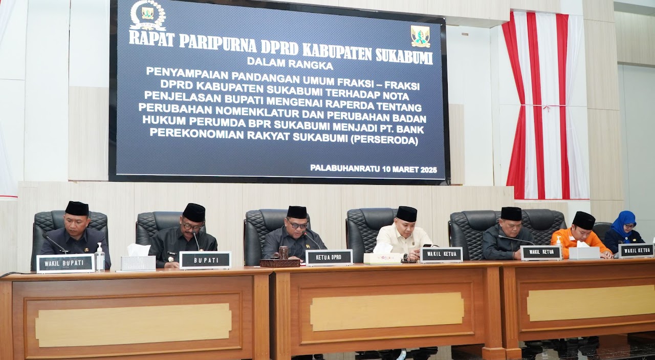 SUKABUMI.-Rapat Paripurna Dewan Perwakilan Rakyat Daerah (DPRD) Kabupaten Sukabumi Ke-8 Tahun Sidang 2025, agenda penyampaian tanggapan dan/atau jawaban Bupati terhadap Pandangan Umum Fraksi-Fraksi DPRD mengenai  Raperda tentang Perubahan Nomenklatur dan Perubahan Badan Hukum Perumda BPR Sukabumi menjadi PT. Bank Perekonomian Rakyat Sukabumi (Perseroda) dan Pengumuman Penetapan Penugasan Komisi Untuk Membahas Raperda. berlangsung di Ruang Rapat utama Gedung DPRD Kabupaten Sukabumi, Pada Rabu, (12/03/2025).